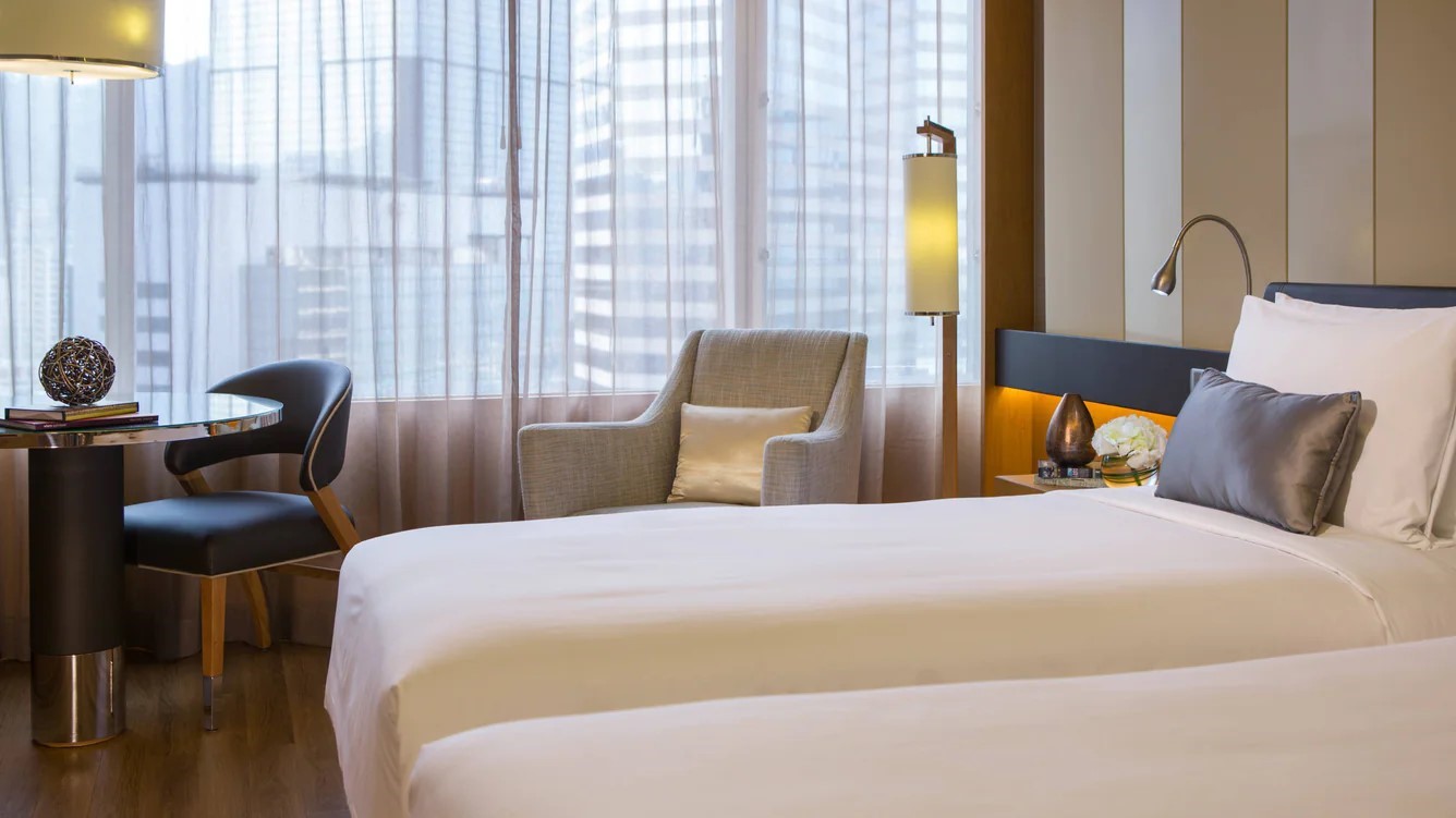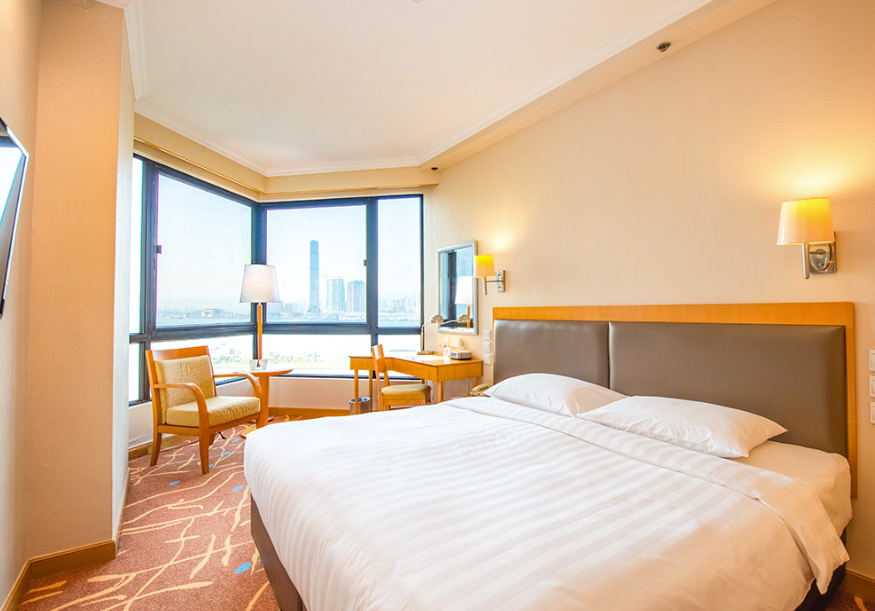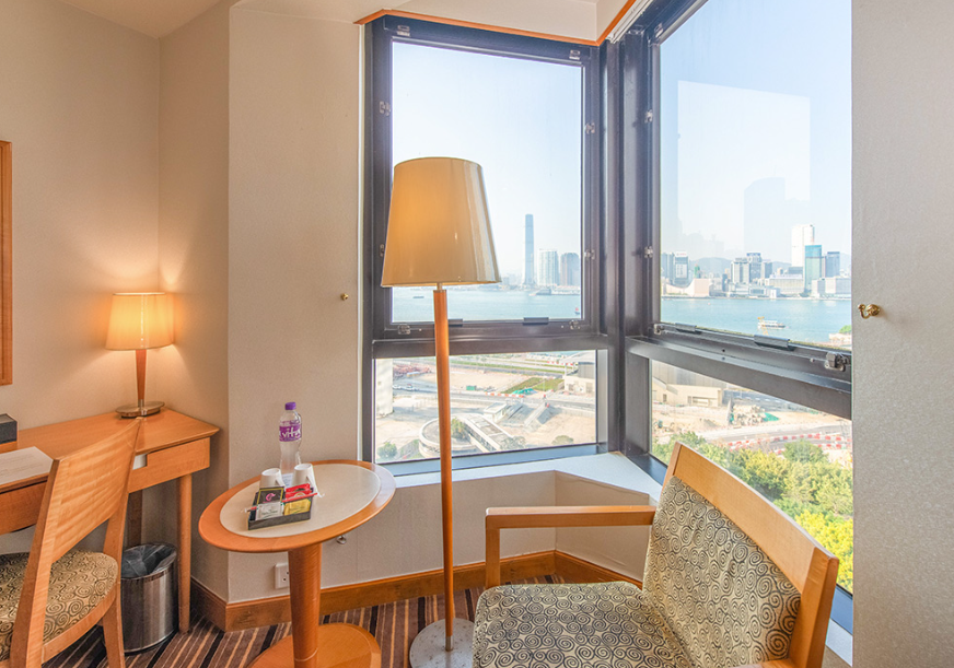 Harbour View Room overlooks stunning Victoria Harbour in a smartly furnished setting.